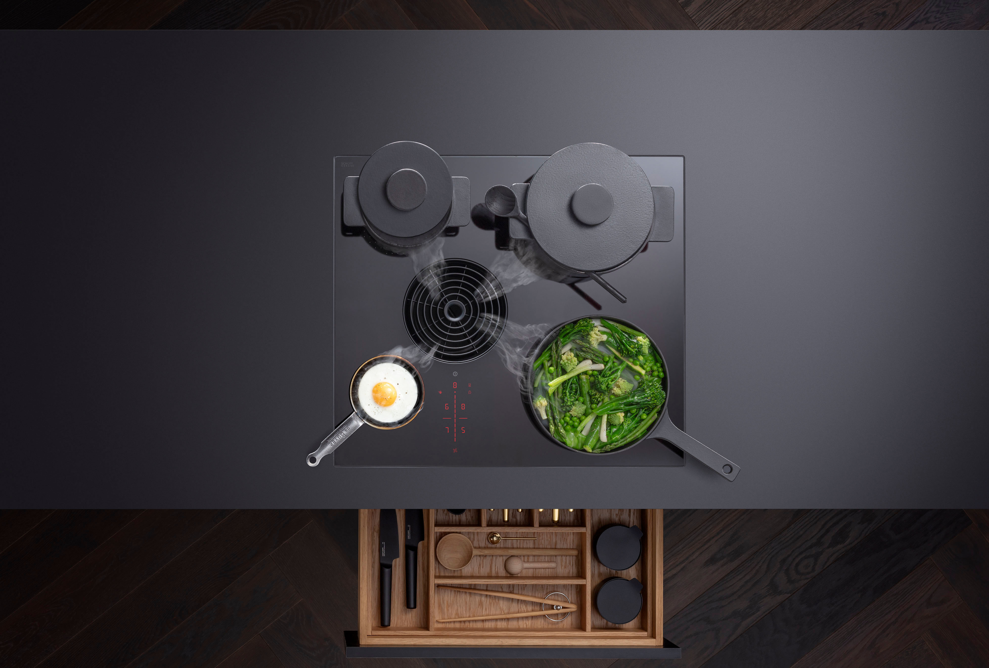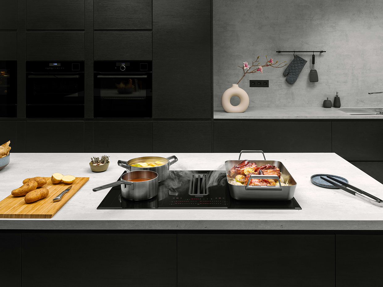 Der Kohlefilter dieses integrierten Dunstabzugs hat eine besonders lange Lebensdauer und lässt sich im Backofen regenerieren. Die Kombination von Induktionskochfeld und Dunstabzug ist zudem Connectivity-fähig. (Foto: AMK)