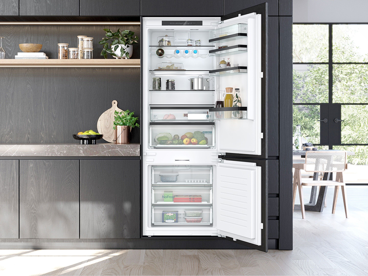 Mehr Platz, mehr Frische: Diese vernetzbare KühlÂgefrierkombination mit 0 Grad Celsius-Frischesystem passt in eine 194 cm hohe und 75 cm breite Nische. Durch ihr neues XXL-Einbauformat ergibt sich 45 Prozent mehr Nutzinhalt. (Foto: AMK)