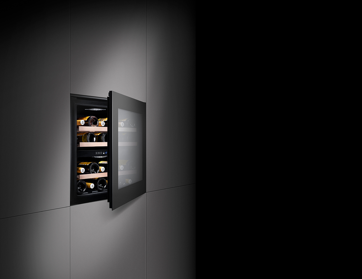 Weintemperieren wahlweise mit einem Einbau- oder Unterbaumodell, jeweils mit zwei Temperaturzonen, Anti-Vibrationssystem und einer Kapazität für 36 bzw. 53 Flaschen. Die Türöffnung erfolgt per Push- &-Pull-Technik. (Foto: AMK)Â