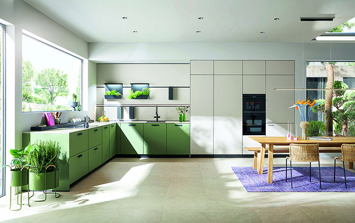 Bild 5a: Im Einklang – eine wohltuende Ruhe und Natürlichkeit strahlt diese Planung in Olivgrün und Kieselgrau aus. Die grüne Front besteht aus Linoleum, das zu mehr als 80 Prozent aus nachwachsenden Rohstoffen hergestellt wird. Die nachhaltige Oberfläche überzeugt zudem mit einer samtigen Haptik. (Foto: AMK)