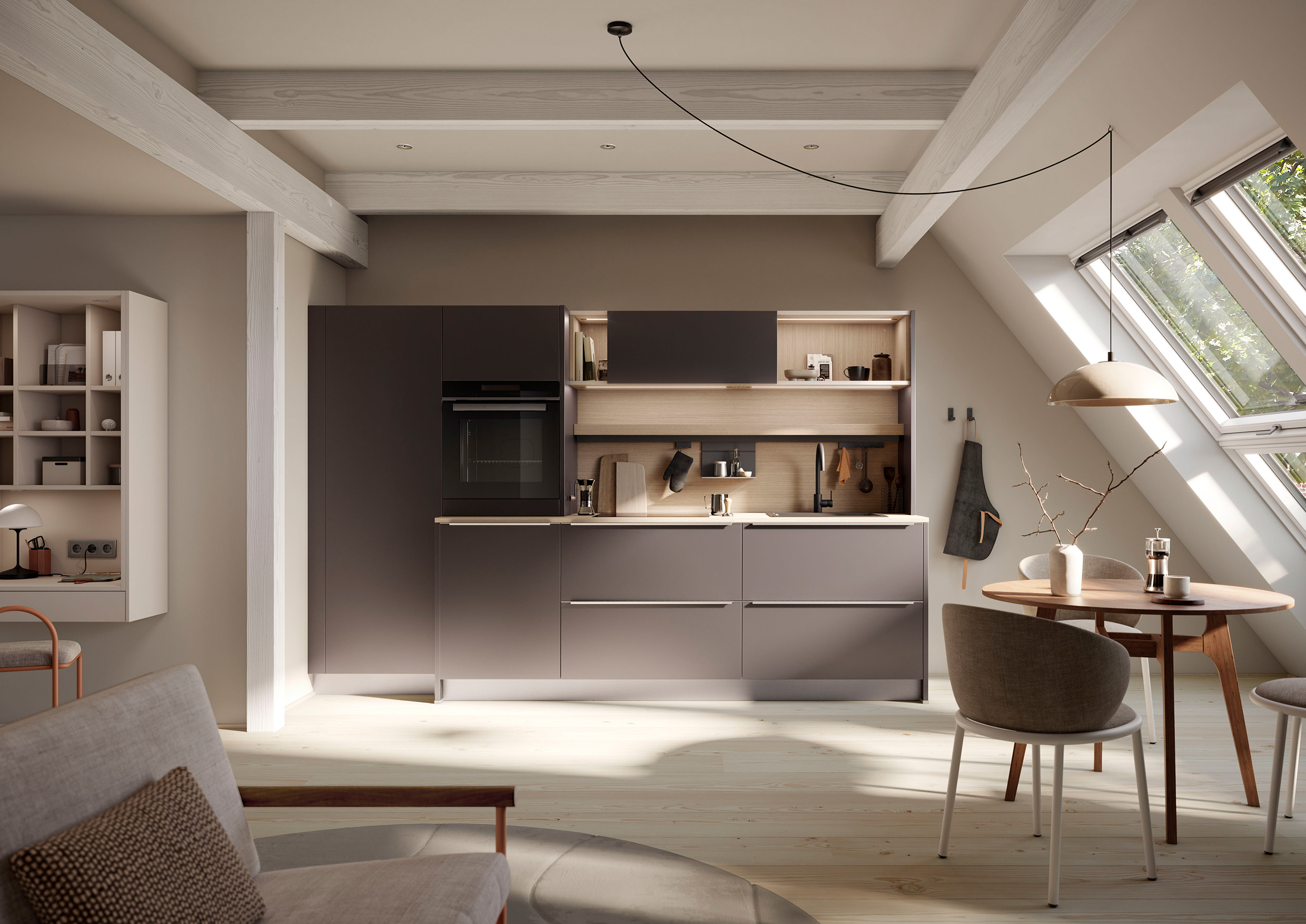 Bild 4: Modern und gemütlich wirkt diese grifflose Küchen- und Wohnlandschaft mit ihrem minimalistisch-klaren Design und den feinen, schmalen Rahmenfronten. Der von der Natur inspirierte zarte Farbton erinnert an helle Muscheln und harmoniert ausgezeichnet mit den dunkleren Eichenholz-Fronten. (Foto: AMK)Â