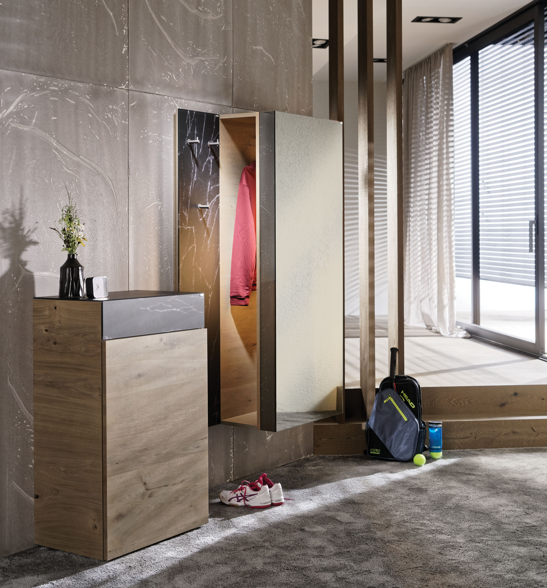 Bild 1: Da der Eingangsbereich oftmals klein und schlicht gehalten ist, müssen die Massivholzmöbel kompakt sowie funktional sein und sollten dennoch Wärme als auch Gemütlichkeit ausstrahlen. Foto: IPM/Voglauer