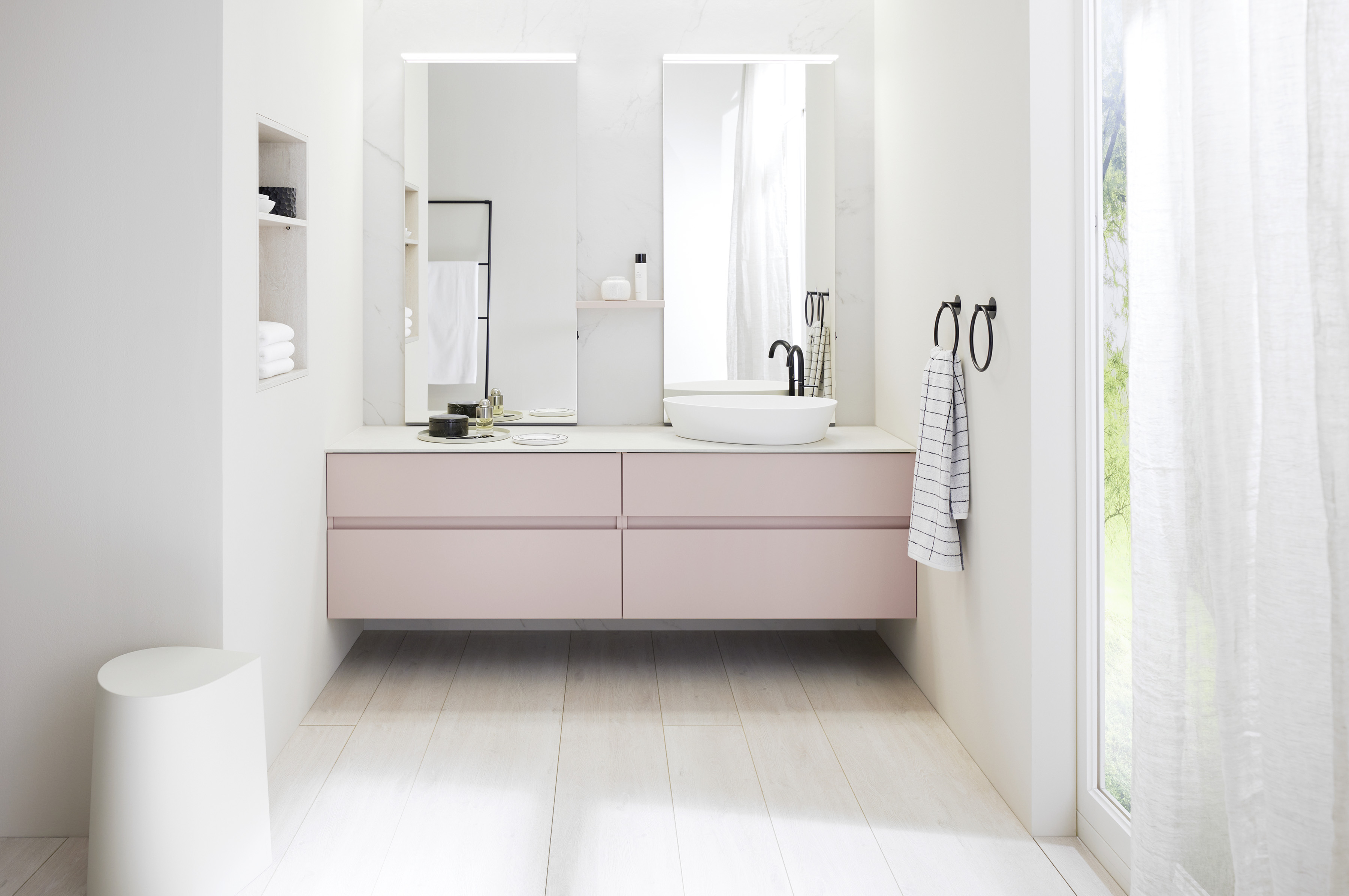 Bild 1: Mit qualitätsgeprüften Möbeln wird das Badezimmer zum Wohlfühlort, hier mit grifflosen Lackfronten in Rosé. Foto: DGM/Burgbad