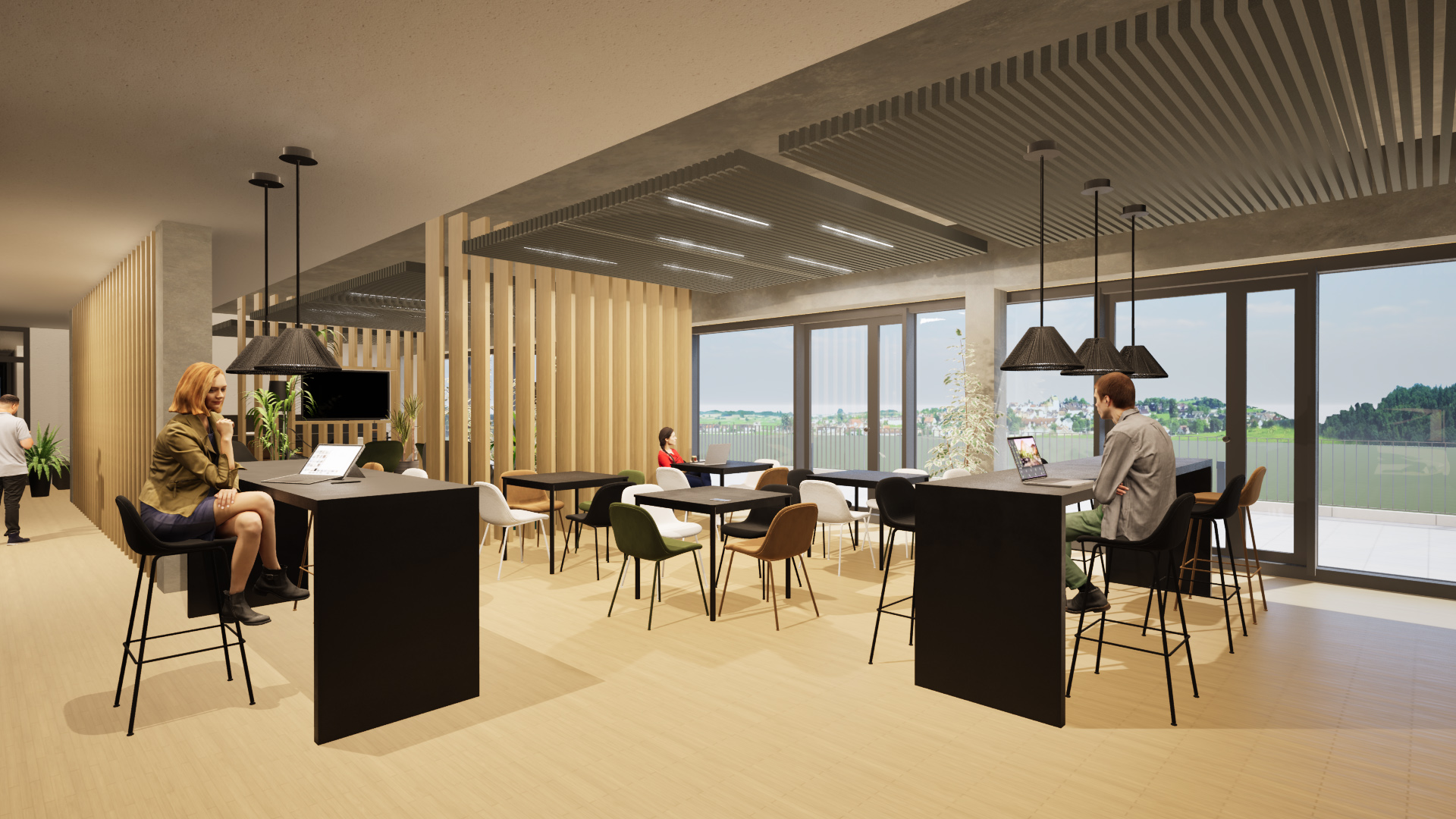 Bild 3: Das Boardinghouse als Ort des Austauschs: der große Aufenthalts- und Gemeinschaftsbereich. Visualisierung: Fourmove Architekten