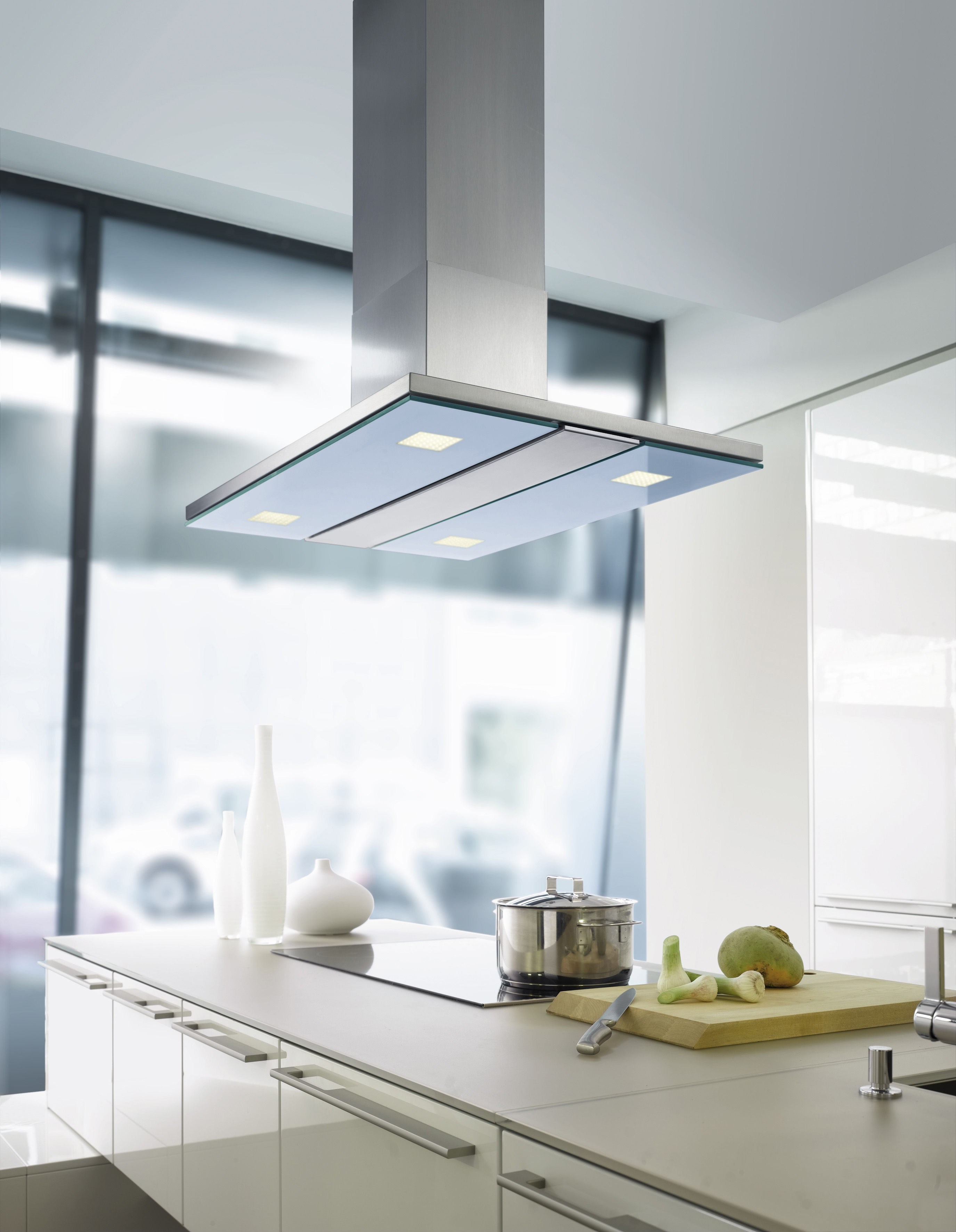Attraktive Umluft-Inselhaube, die sich z.B. auch fĂĽr den Einsatz in einem Passiv- oder Niedrigenergiehaus eignet. (Foto: AMK)