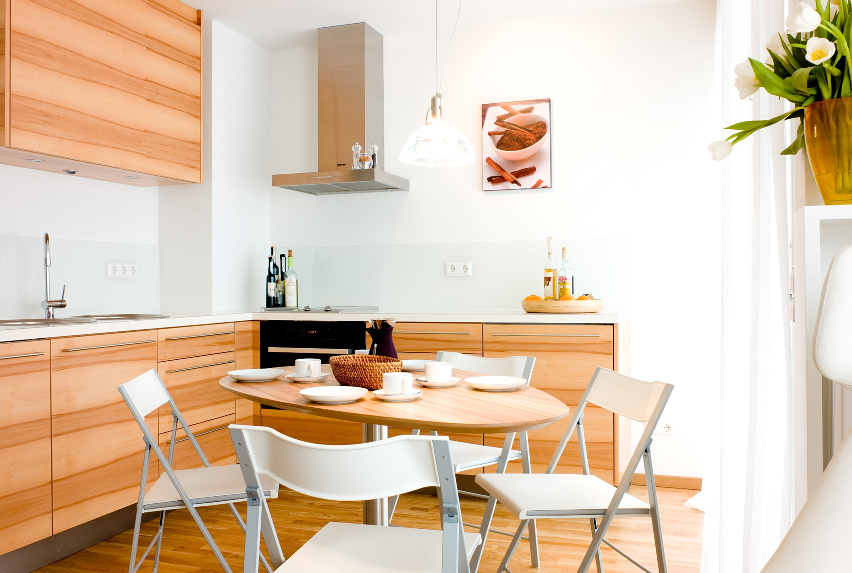 Ein schönes Beispiel für den gelungenen Einsatz von Furnieren ist ein von dem Unternehmen Ursula Maier Werkstätten aus Markgröningen neu ausgestattetes Wohnhaus in der Nähe von Stuttgart. Im Fokus der Arbeiten stand die Neugestaltung der Küche und des angrenzenden Essbereichs. „Die neuen Oberflächen fallen sofort ins Auge: In der Küche dominieren jetzt charakterstarke Fronten aus Apfelbaum. In Kombination mit den hellen Arbeitsflächen wirkt der Bereich großzügig und einladend“, so Klaas. Dazu kam ein neuer Wintergarten, bei dem der Übergang verblendet wurde. Die Verblendung wurde dabei auf Gehrung gearbeitet. Dadurch erscheint das Furnier durchgehend plastisch. Den Abschluss des Renovierungsprojektes bildete die Überarbeitung des Badezimmers mit Teakholz-Furnier: Dieses sorgt in Kombination mit neuen Farben und Beleuchtungselementen für eine warme und wohnliche Atmosphäre, die den Aufenthalt im Bad zum Genuss macht.