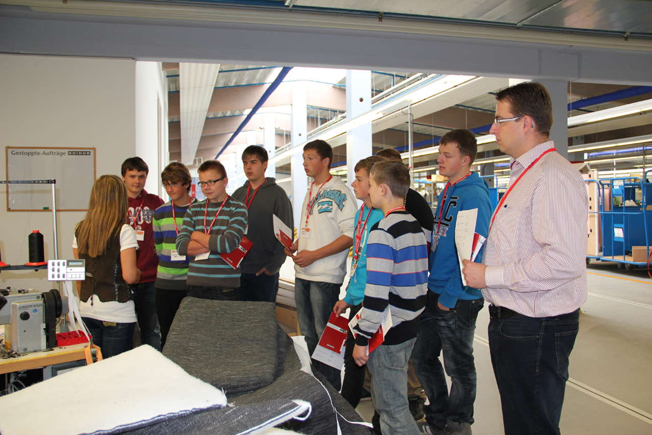 Die Schülerinnen und Schüler lernten in den Unternehmen alles Wichtige rund um die Herstellung hochwertiger Polstermöbel kennen. „Sie waren begeistert, dass sie einzelne Arbeitsschritte wie zum Beispiel Nähen oder Tackern selbst ausprobieren konnten. Bei uns haben sich aus einer Klasse gleich vier Schüler zum Praktikum angemeldet“, berichtet Bernd Dahm, Geschäftsführer des Unternehmens Koinor. Ähnliches konnte die Firma Arco vermelden, in der den Schülern unter anderem eine Führung durch die Produktion angeboten wurde. Dazu eine Teilnehmerin: „Es war einfach toll, dass wir Stoff- und Lederreste mitnehmen durften, um uns Taschen oder Kissen zu nähen.“ Frank Starklauf, Marketingleiter der Firma FM Munzer, weiß ebenfalls Positives zu berichten: „Wir waren mit der Resonanz und dem Interesse seitens der Jugendlichen mehr als zufrieden. Die Jugendlichen und ihre Lehrer haben auf uns einen sehr interessierten und positiven Eindruck hinterlassen. Wir glauben sogar, dass wir ein paar Bewerbungen bekommen werden – was natürlich sehr erfreulich wäre.“