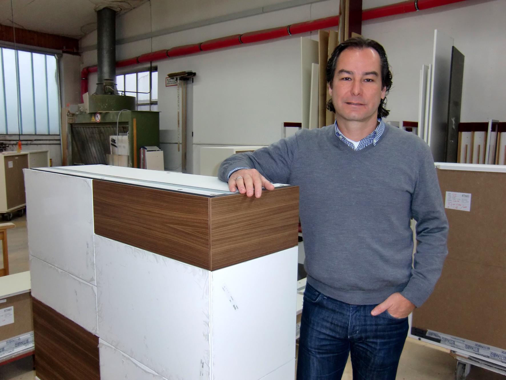 Bild1: Wolfgang Kettnaker präsentiert ein frisch furniertes Sideboard. Foto: IFN / Kettnaker Möbelmanufaktur