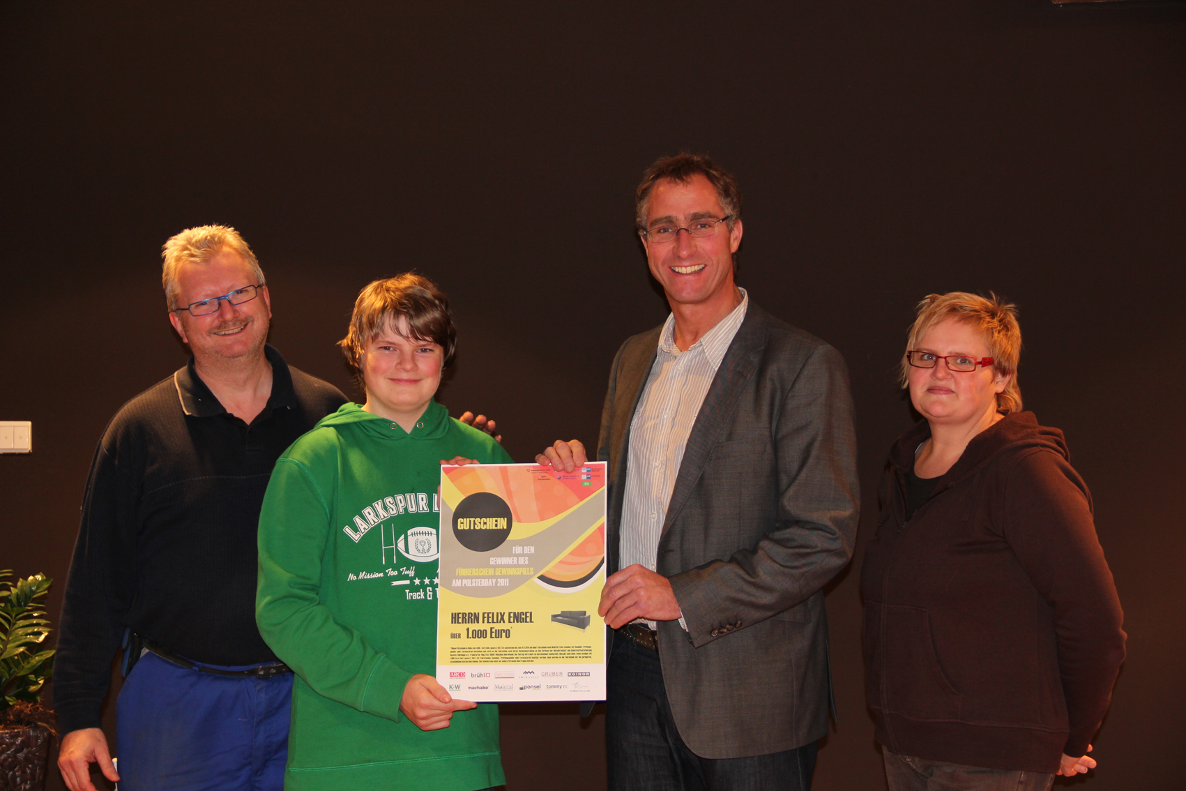 Bildunterschrift: „Stolz wie Oskar und glücklich wie ‚Felix’: Polster Day-Gewinner Felix Engel bei der Gutschein-Übergabe mit Koinor-Geschäftsführer Bernd Dahm und seinen Eltern Sandra (rechts) und Wolfgang (links)“.