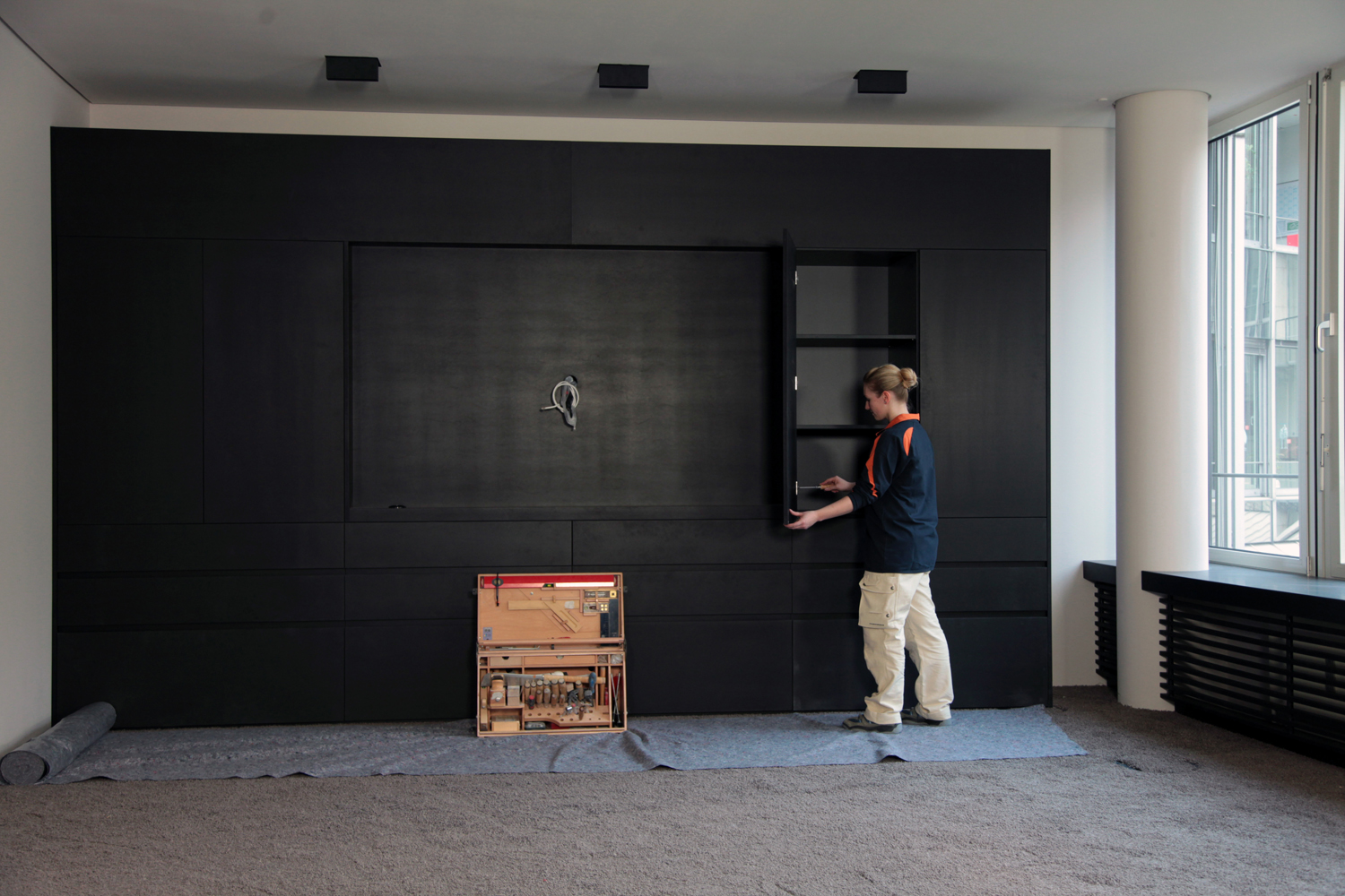 Bild 1: Eine Holzmechanikerin der Fachrichtung „Montieren von Innenausbauten und Bauelementen“ beim Aufbau von passgenauen Einbaumöbeln in einem Büro in München. Foto: HDH