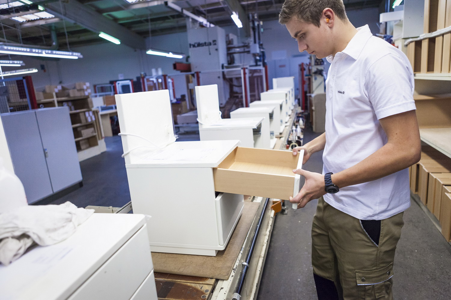 Bild 2: Ein Holzmechaniker der Fachrichtung „Herstellen von Möbeln und Innenausbauteilen“ bei der Endkontrolle eines Möbelstückes. Foto: HDH