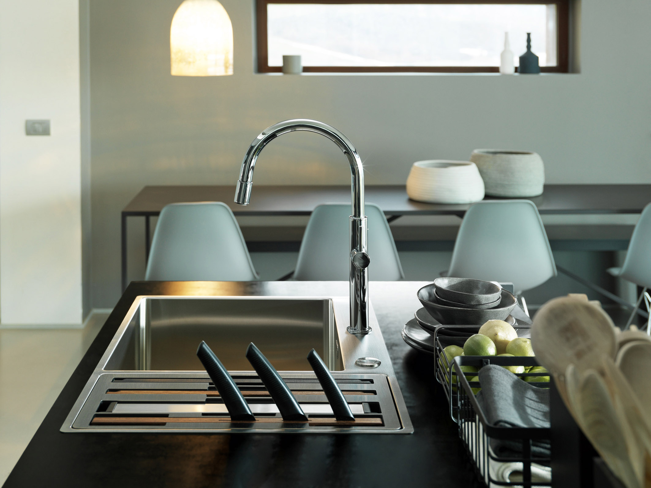 In Gastronomieküchen muss vor allem in Stoßzeiten selbst der kleinste Handgriff sitzen. Dagegen nicht unbedingt in privaten Lifestyle-Küchen, auch wenn dort ebenso mit Leidenschaft und Kreativität auf hohem Niveau gekocht wird. „Dennoch sind viele Entwicklungen für die Gastroküche auch in die private Küche eingezogen und die Hersteller innovativen Küchenzubehörs machen sich Gedanken, wie sie den ohnehin sehr guten Workflow an der Spüle immer noch ein bisschen mehr optimieren könnten“, sagt Volker Irle, Geschäftsführer der Arbeitsgemeinschaft Die Moderne Küche e.V. (AMK). Zum Beispiel anhand des Spülen-Designs sowie eines exzellent abgestimmten Zubehörs inklusive Küchenarmatur und durch noch mehr Flexibilität bei allen vor- und zubereitenden Tätigkeiten.