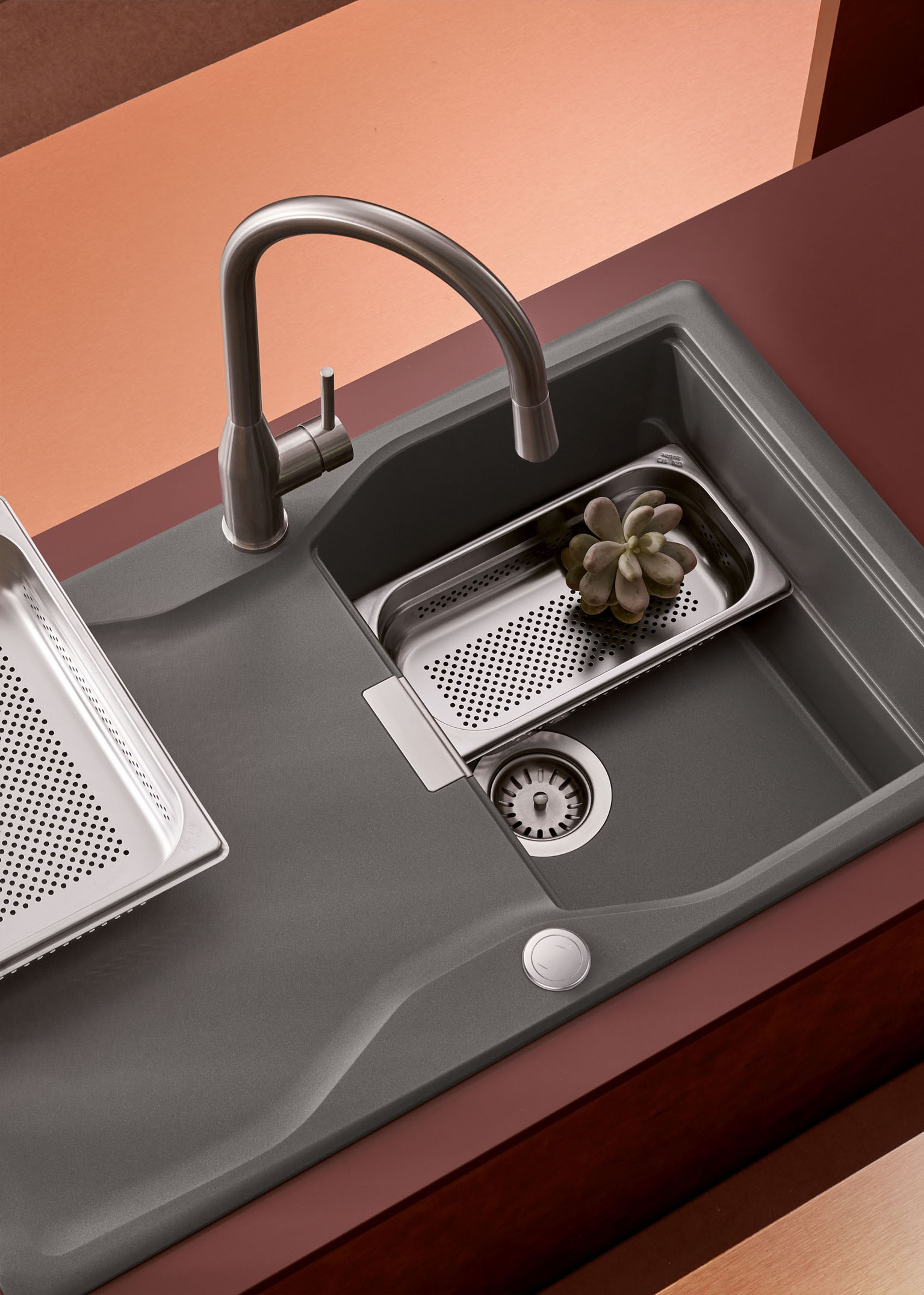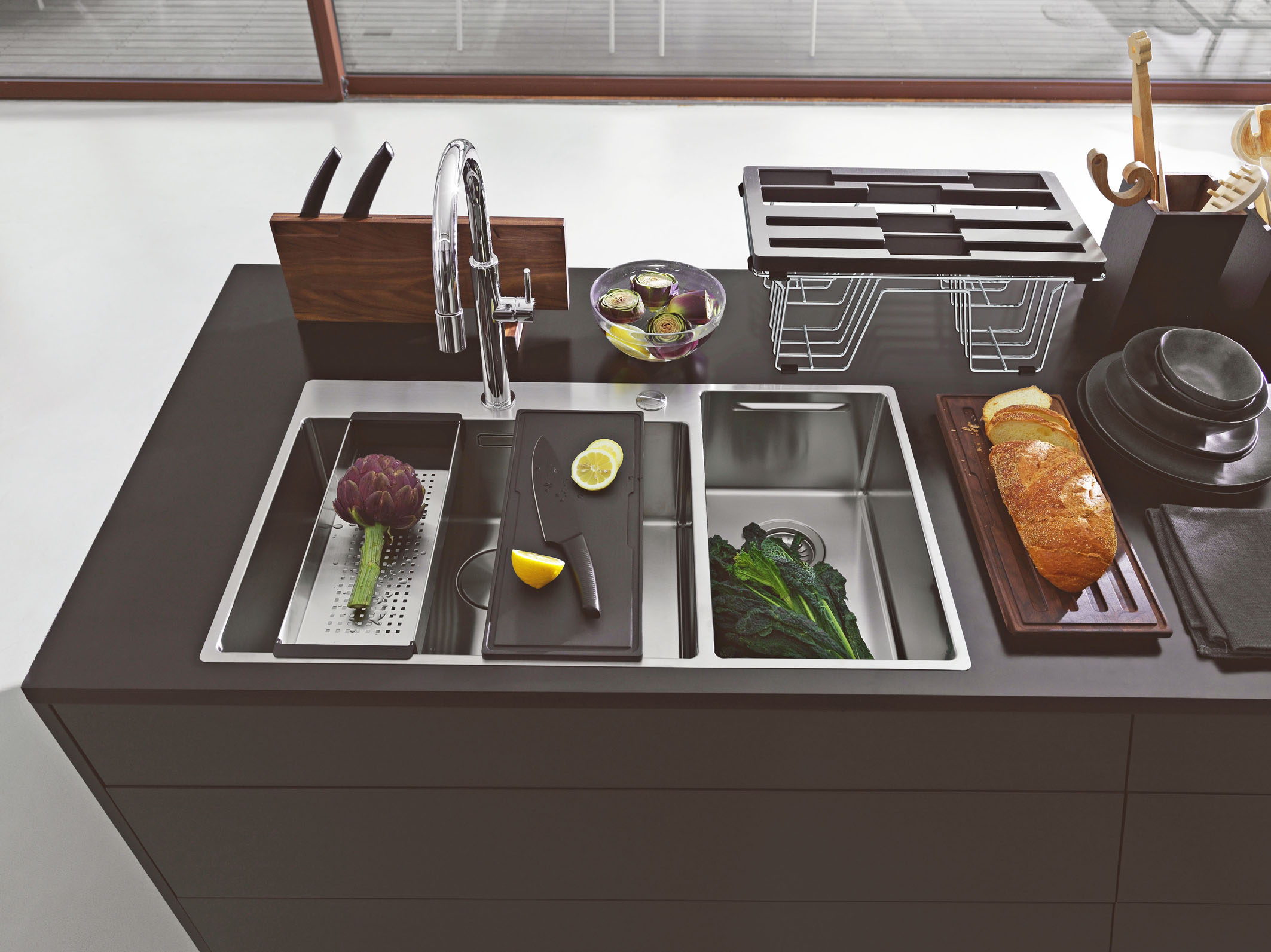 Bei einer weiteren, neuen Multifunktionsspüle sind die wichtigsten Koch- & Küchen-Accessoires – Messerblock, Schneidbretter, Geschirr-Abtropfgitter und eine gelochte Edelstahlschale – in Form eines ineinandergesteckten Ordnungssystems direkt an der Spüle jederzeit griffbereit. Dazu hat sie ein großes Hauptbecken und ein zweites, schmaleres Becken mit einer Abdeckung. Im unbenutzten Zustand ist das gesamte Zubehör in diesem schmaleren Becken nahezu unsichtbar verstaut. Zum Vorbereiten oder Kochen wird es herausgenommen und das Hauptbecken dann in eine zusätzliche Arbeitsfläche umfunktioniert.