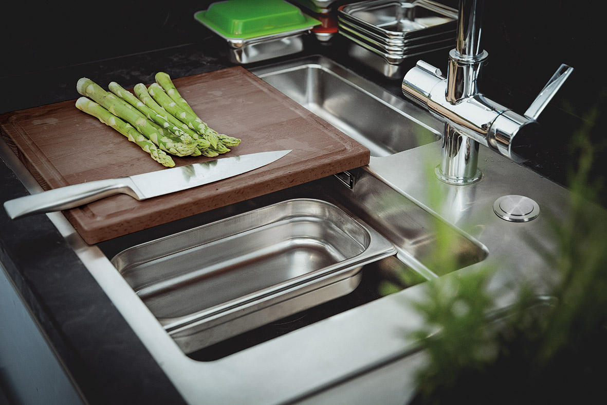 Selbst Profi-Ansprüche an eine Spüle können erfüllt werden, z. B. mit System-Edelstahlbecken, die auf jeder Arbeits¬ebene mit dem bekannten Edelstahl-Behältersystem nach Gastro-Norm-Standard (GN) kompatibel sind. Dies ermöglicht 1a-Arbeitsabläufe: Die Lebensmittel lassen sich beispielsweise in GN-Behältern im Kühlschrank bevorraten und werden zur Vor-/Zubereitung des Essens einfach in die Spüle eingehängt. Von dort geht’s dann ohne Umfüllen direkt weiter zum Kochen, Garen oder Braten. Die fertigen Speisen können anschließend auch in den GN-Behältern serviert werden. Oder man parkt sie auf und in der Spüle, während das Essen auf den Tellern schön angerichtet wird.