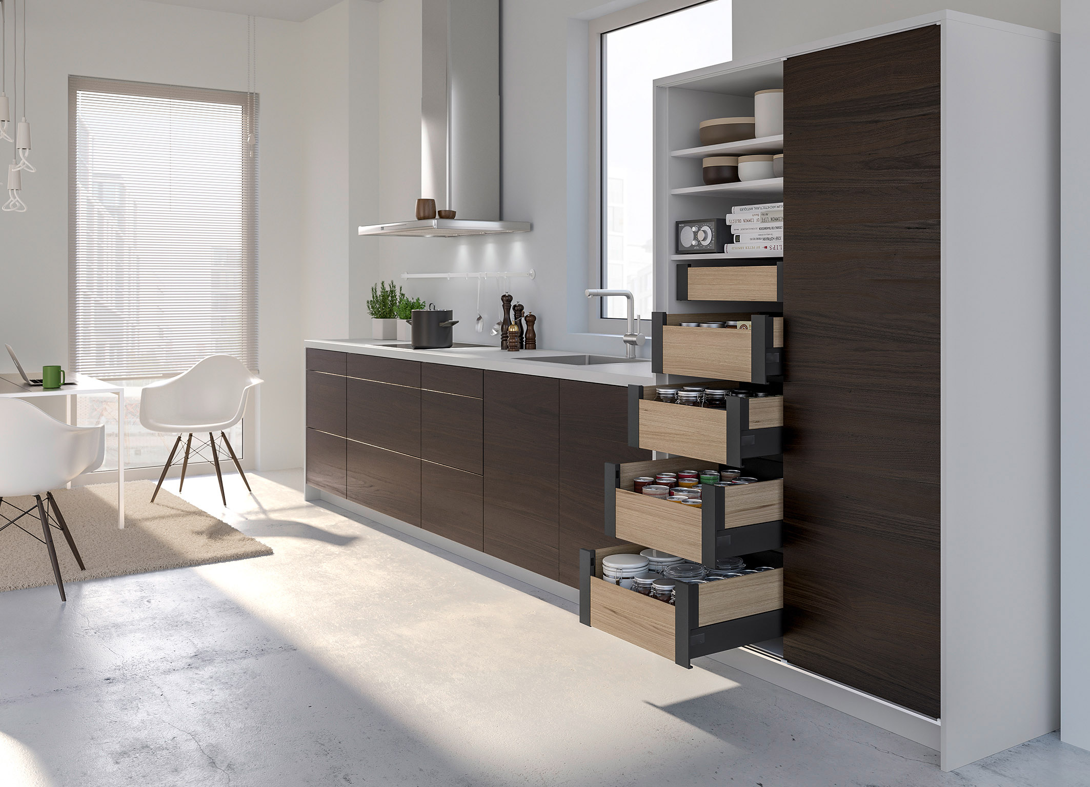 In Hochschränke lassen sich nicht nur mehrere kompakte Einbaugeräte (z. B. Backofen, Dampfgarer und Kaffeevollautomat) integrieren – inzwischen haben auch Schubkästen den Hochschrank erobert, da sie das vorhandene Stauraumpotenzial in der gesamten Tiefe des Hochschranks optimal ausnutzen, es außerdem beweglich und somit von drei Seiten zugänglich machen. Wo kein Hochschrank Platz hat, weil zum Beispiel eine Dachschräge im Weg ist, bietet der Unterschrankbereich mit seinen vielen Schrankvarianten in unterschiedlich breiten Rastermaßen die perfekte Stauraumlösung. Je nach Platzangebot können das Unterschränke mit mehreren schmalen Auszügen sein. Sie werden auch gerne mit extrabreiten oder extrahohen Auszügen kombiniert, was zudem optisch reizvoll ist. Frontauszüge mit Innenauszügen nutzen den vorhandenen Stauraum auf zwei Ebenen optimal aus; alles ist dabei übersichtlich und rutschfest untergebracht – vom Besteck bis zum Kochgeschirr.