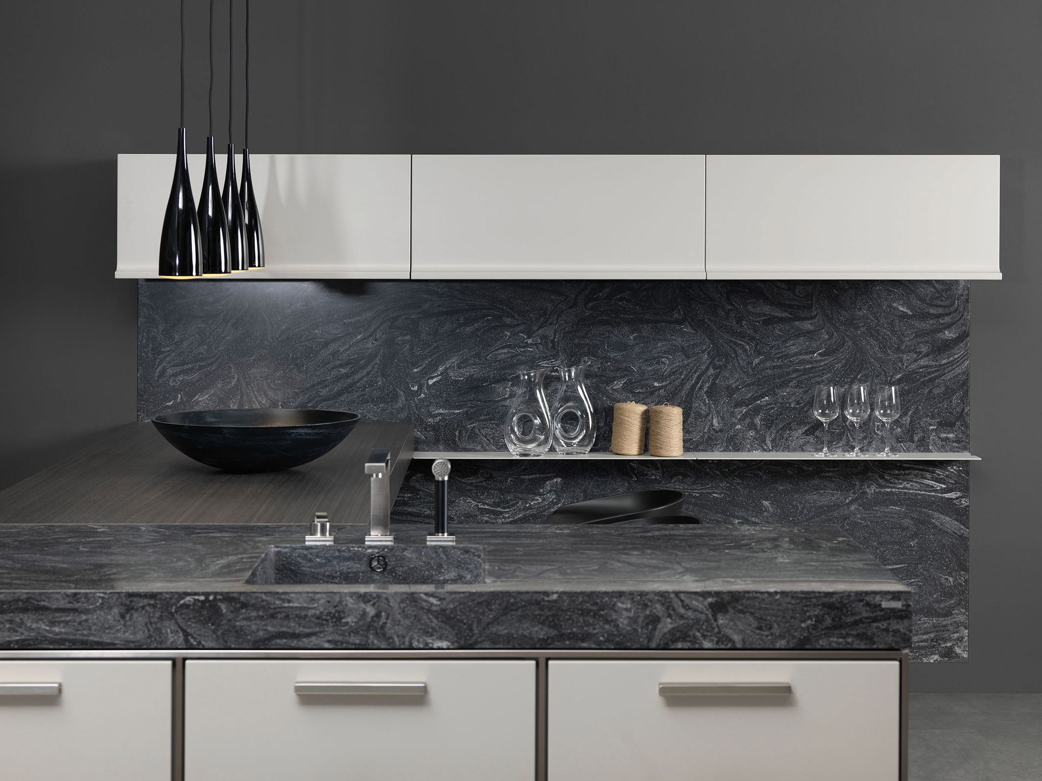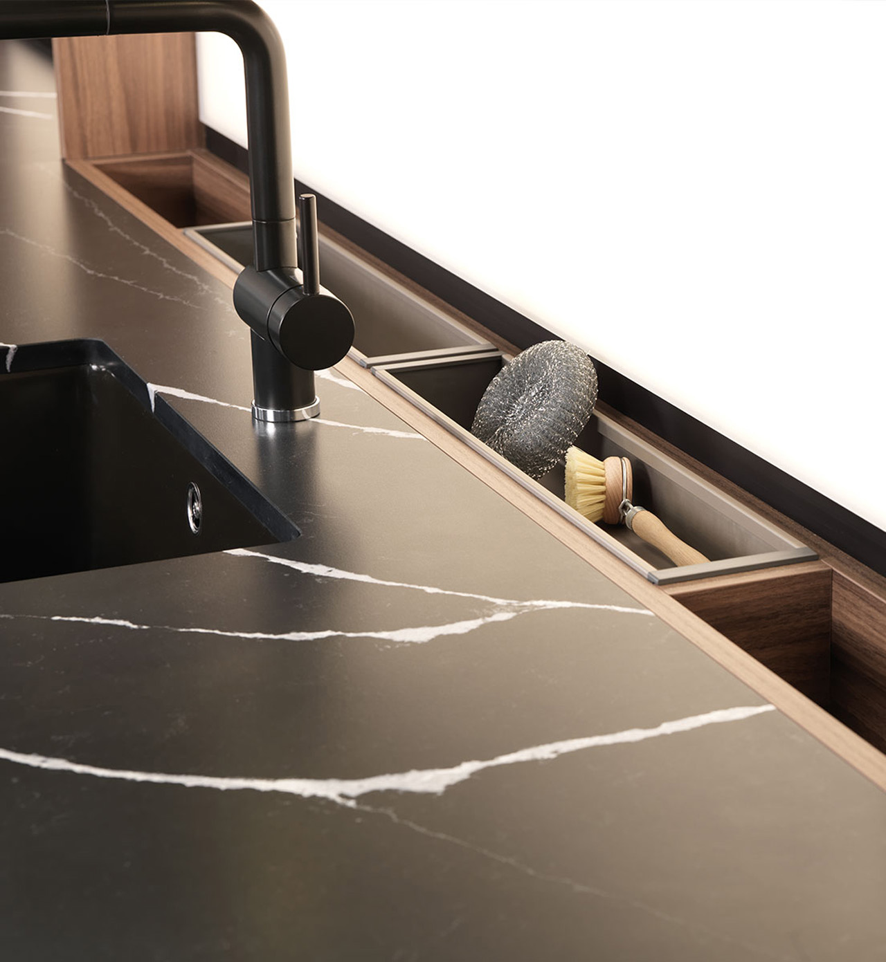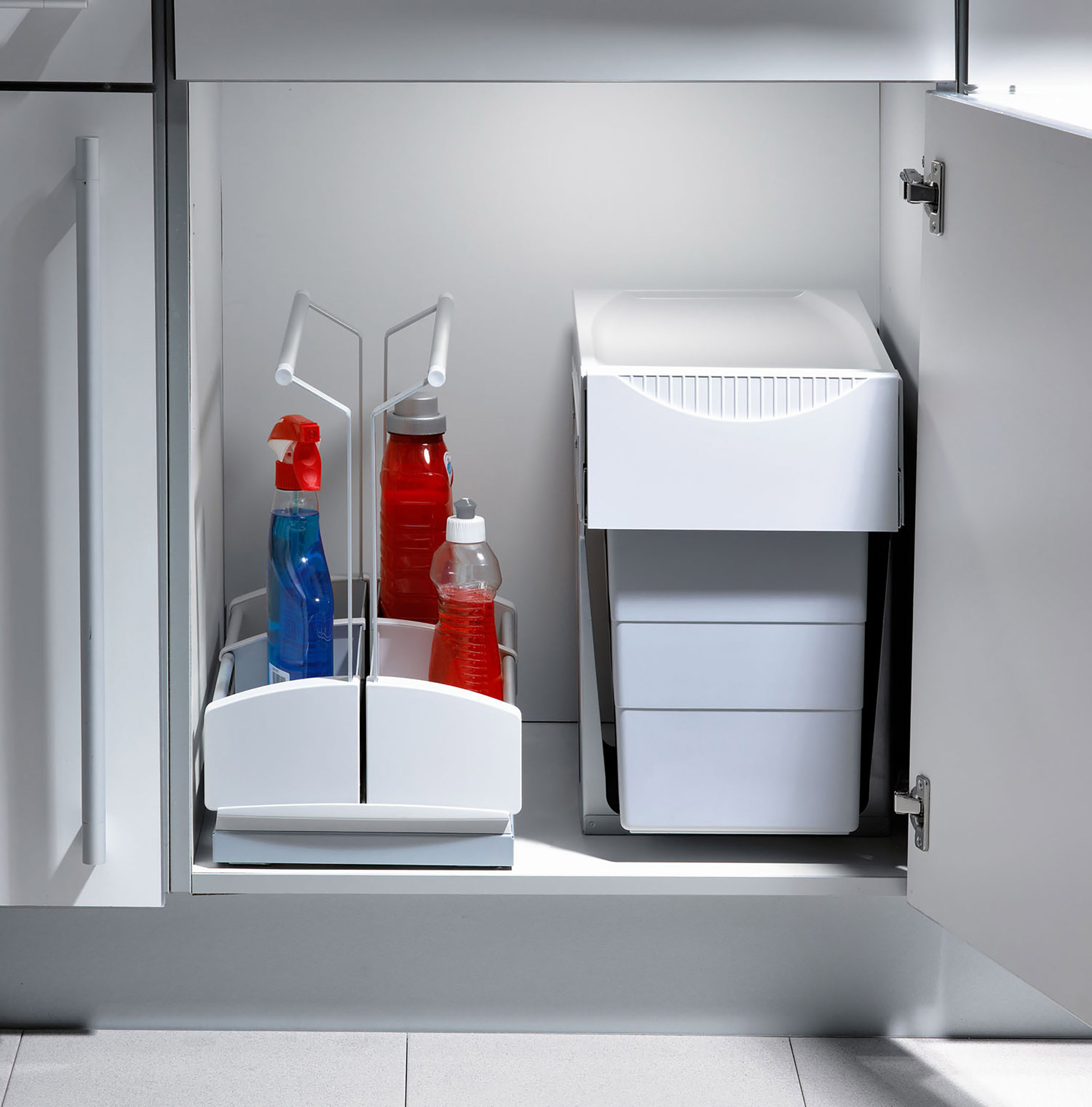 „Selbst wenn die Küche ziemlich klein ist, ein Abfalltrennsystem, das sich im Spülenunterschrank extra schlank macht, ist dennoch möglich“, sagt Volker Irle. Und auch der Bereich direkt hinter der Spüle lässt sich nutzen, um dort ein schmales Ordnungssystem einzuplanen. Außerdem bietet sich die Nischenrückwand an: Mit filigranen Wandborden lassen sich hier zusätzliche Abstellflächen schaffen. Von wegen „tote Ecken“. Wie sich brach liegender Stauraum in eine Komfortzone verwandelt, zeigen einfallsreiche Lösungen wie Eckunterschränke mit voll herausschwenkenden Ablagen.
