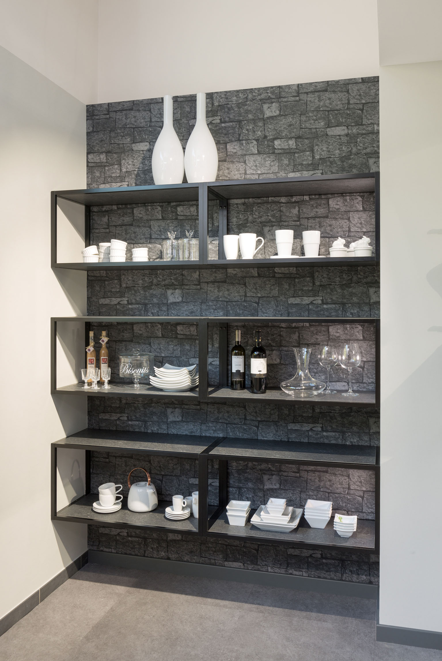 Eine weitere Möglichkeit sind die neuen, attraktiven Regalsysteme. Damit lassen sich z. B. Mauervorsprünge und verwinkelte Grundrisse prima kaschieren. In kleinen Küchen mit hohen Wänden, kann sogar die Zimmerdecke mit eingeplant werden – in Form eines deckenhängenden Regals.